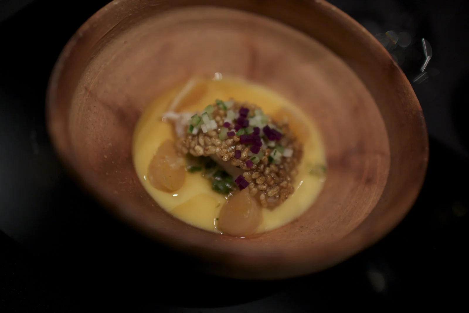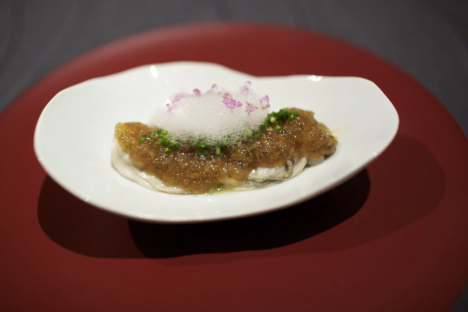 Special oyster from Akkeshi, Hokkaido served with smoked oyster purée and ponzu vinegar with céleri-rave. This was the first disappointing course. The oyster was very salty and its only flavor that of unpleasant fish. The ponzu vinegar was too assertive distracting from any sweet components the oyster may have contributed. The portioning was purportedly for one bite; but that was impossible unless your mouth looks like Shrek's.