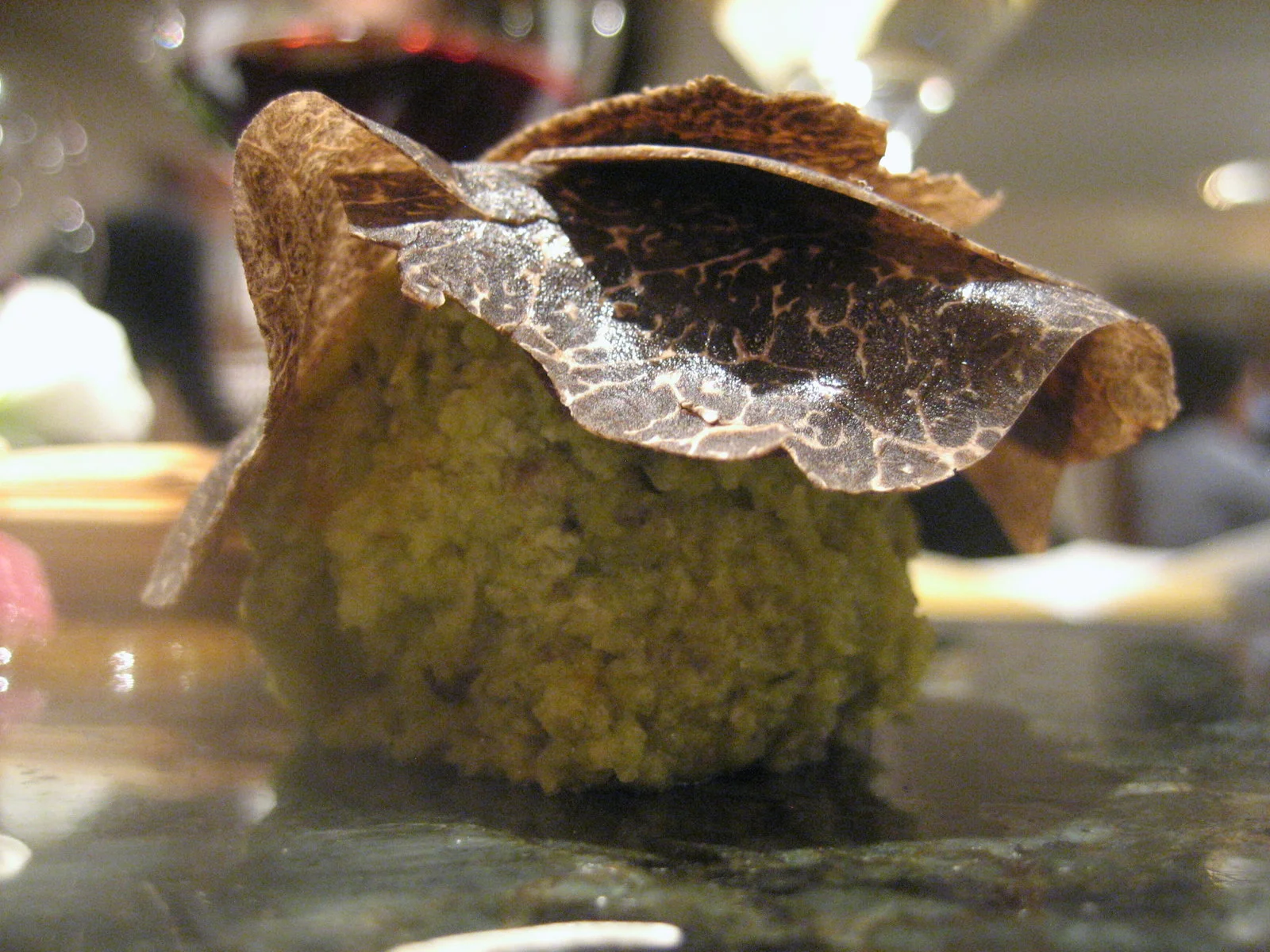 Crispy chargrilled "Akamutsu" with vinegar flavor on egg pudding, smooth taro potatoes. As good as an egg pudding can taste, I suppose. I have Japanese friends who go crazy for egg puddings like chawanmushi, as this is a very traditional dish. Being a New yorker, I don't have the same nostalgic connection. (I can, however, enjoy mustard on my hot dog.) The smooth taro potatoes made this entire dish have a texture of smooth pudding. The textural monotony required that the flavor and temperatures be perfect: this dish was served just under room temperature and the flavor uneventful. Venison with wasabi mashed potatoes and matsuke mushrooms. A thick cut of lean venison exquisitely cooked. There was no cooking gradation from surface to center, all uniform. The beautiful pink color glistened in the light. But the real highlight of the plate was the wasabi mashed potatoes crowned with shaved black truffle. The truffle was some of the most fragrant black truffle I have ever seen, easily detectable from across the room. The squeaky matsuke mushroom was grilled just enough to remove the water and intensify the flavor without overcooking. This was the highlight course of the night.
