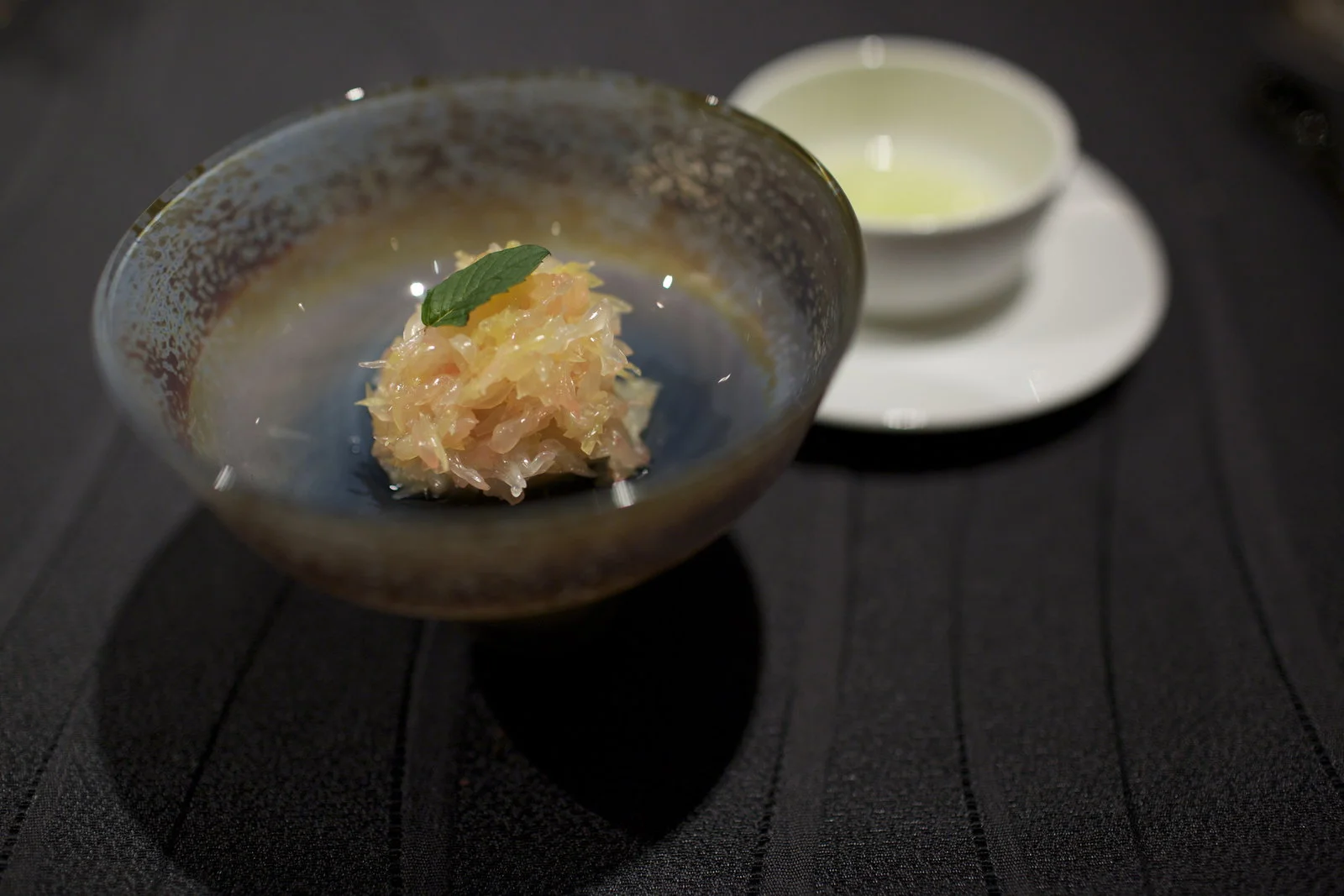 Steamed rice with cherry blossom tea topped with aromatic sakura shrimp from Shizuoka. Another incredible course. These tiny shrimp were eaten whole and had a very subtle flavor of shrimp. Since they were so small, most of the flavor and texture came from the crispy shells. The heads were the most flavorful part, I really wanted more. These were served on top of rice cooked so perfectly that each grain developed a springy texture. The rice stuck together without sacrificing its shape, a clear sign of perfect cooking.