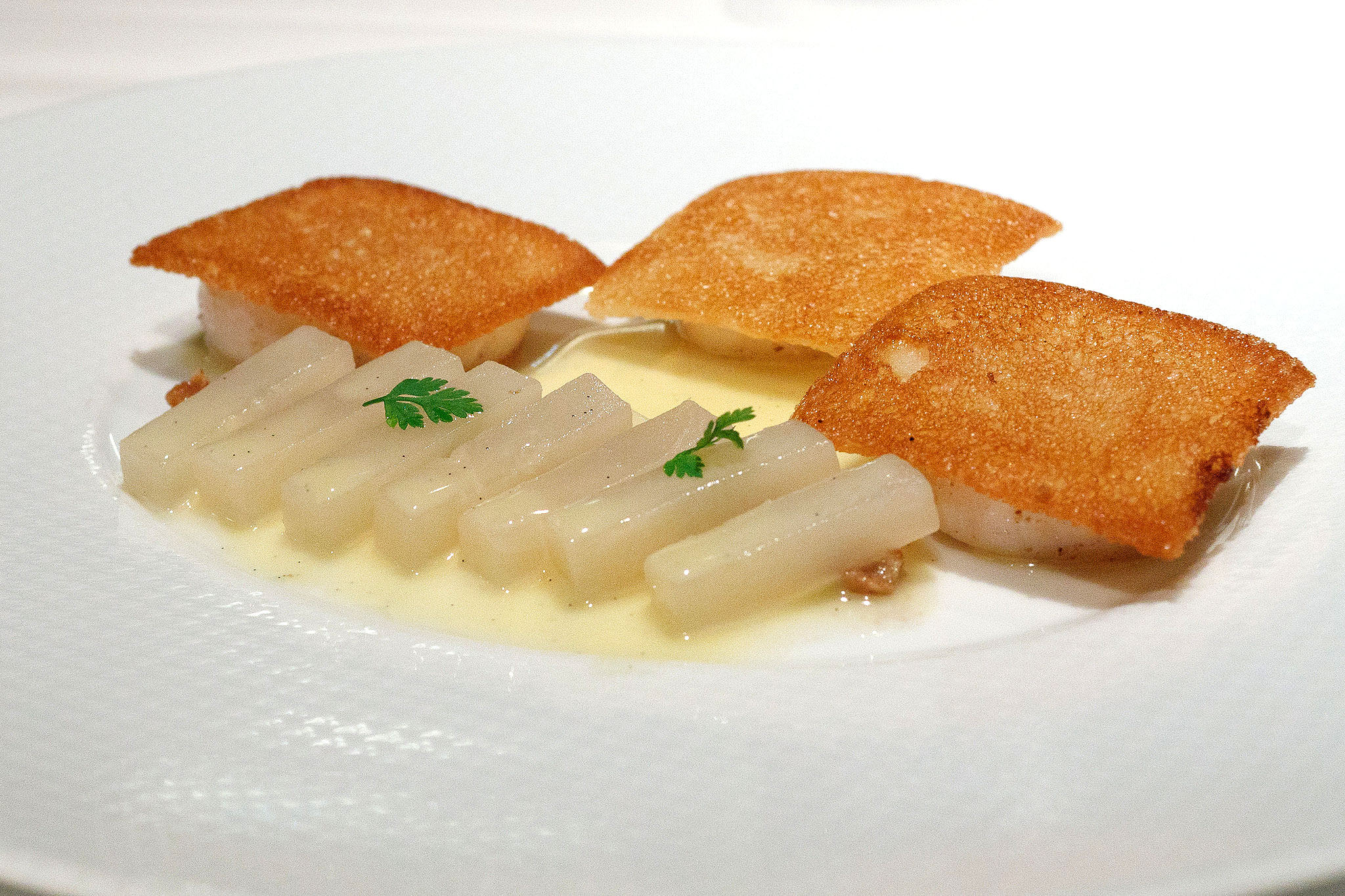 Filet de chapon poêlé, fondue de poireau et topinambour, émulsion d'oursin - Roasted scorpionfish with a leek and Jerusalem artichoke confit in a sea urchin emulsion. This was a fantastic dish. The skin of the roasted scorpionfish became slightly crunchy and its flavor intensified during the cooking process. The interior of the fish was smooth and succulent. The combination of Jerusalem artichoke and sea urchin was particularly interesting: the artichoke somehow made the already sweet urchin taste sweeter, and the salty skin brought everything together. This was the highlight of the meal for me.