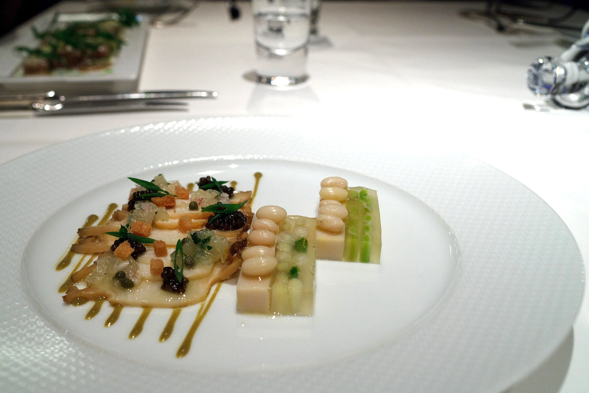 Lamelles d'ormeau tiédies, terrine de haricot coco et poireau aux câpres et caviar, sauce au corail - Thinly sliced warm abalone with a white bean and leek terrine with caviar, lemon, caper, and a "coral sauce." It's interesting how slicing abalone really thin changes the texture from rubber to something a bit more elastic like cooked octopus. The white beans were a little starchy on the inside leaving them perfectly round, but unfortunately dry. This made it difficult for them to integrate with the rest of the dish. I wish the urchin was emphasized a bit more because the way it interacts with the artichoke was fascinatingly delicious.